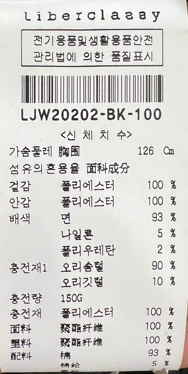 1. 제품 소재 (섬유의 조성 또는 혼용률을 백분율로 표시, 기능성인 경우 성적서 또는 허가서) 겉감:폴리에스테르 100% / 안감:폴리에스테르 100% / 배색:면 93%,