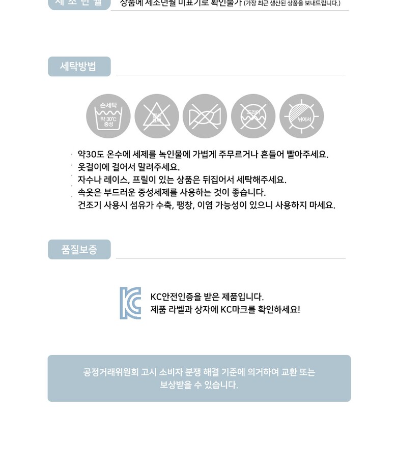 | 6. 세탁방법 및 취급시 주의사항 | 30도 온수로 중성세제를 사용하여 손세탁 및 분리세탁을 권장합니다. |