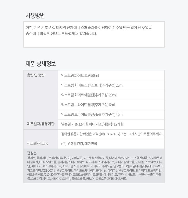 | 9. 사용 시 주의사항 | 1. 화장품을 사용 중 붉은 반점, 부어오름, 가려움증, 자극 등의 이상이 있는 경우, 적용 부위가 직사광선에 의하여 이상이 생긴 경우 사용을 중지하시고 피부과 전문의와 상담하세요. 2. 상처가 있는 부위, 습진 및 피부염 등의 이상이 있는 부위에는 사용하지 마세요. 87. 보관 및 취급시 주의사항 가)사용 후에는 반드시 마개를 닫아두세요. 나)유아ㆍ소아의 손이 닿지 않는 곳에 보관하세요. 다)고온 다습한 곳 및 직사광선 닿는 장소는 피해주세요. |