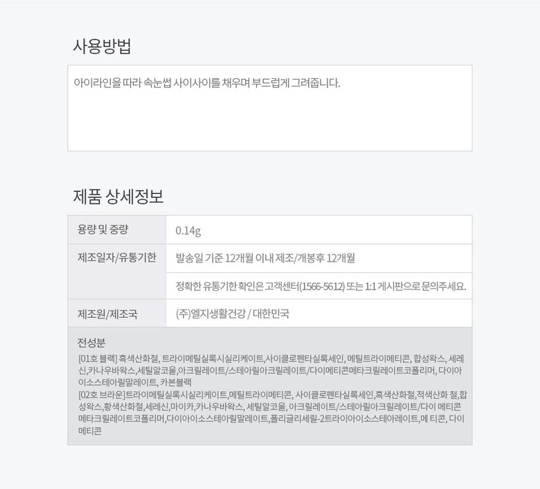 7. 주요성분 [01호 블랙] 흑색산화철, 트라이메틸실록시실리케이트,사이클로펜타실록세인, 메틸트라이메티콘, 합성왁스, 세레