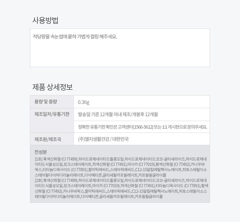 7. 주요성분 | [1호] 흑색산화철 (CI 77499),하이드로제네이티드돌콩오일,하이드로제네이티드코코-글리세라이즈, 외 |
