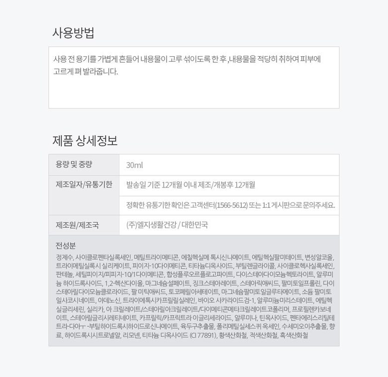4. 사용방법 | 용 전 용기를 가볍게 흔들어 내용물이 고루 섞이도록 한 후 ,내용물을 적당히 취하여 피부에 고르게 펴 발라줍니다. |