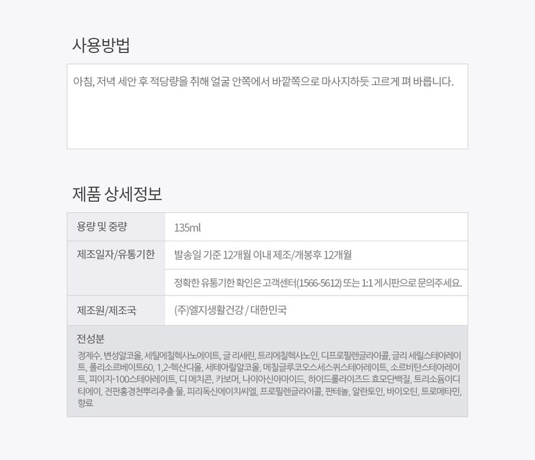 | 9. 사용 시 주의사항 | 1. 화장품을 사용 중 붉은 반점, 부어오름, 가려움증, 자극 등의 이상이 있는 경우, 적용 부위가 직사광선에 의하여 이상이 생긴 경우 사용을 중지하시고 피부과 전문의와 상담하세요. 2. 상처가 있는 부위, 습진 및 피부트러블 등의 이상이 있는 부위에는 사용하지 마세요. 3. 보관 및 취급시 주의사항 가)사용 후에는 반드시 마개를 닫아두세요. 나)유아ㆍ소아의 손이 닿지 않는 곳에 보관하세요. 다)고온 다습한 곳 및 직사광선 닿는 장소는 피해주세요. |