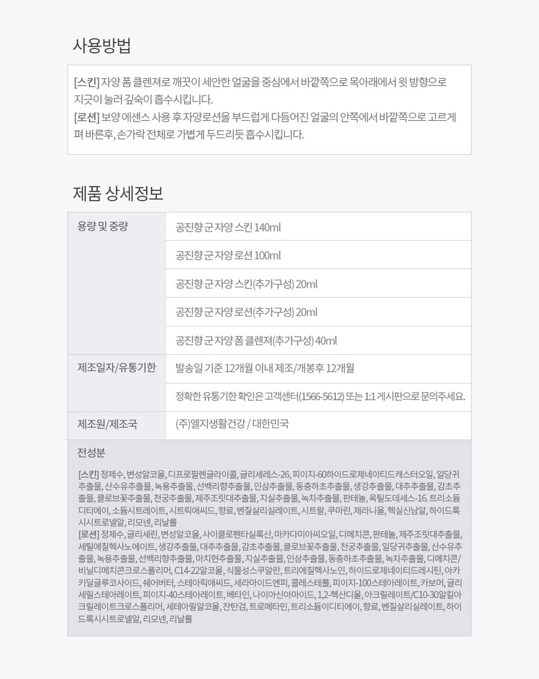 | 1. 용량 및 중량 | 스킨 140ml, 로션 100ml, 외 추가구성 |