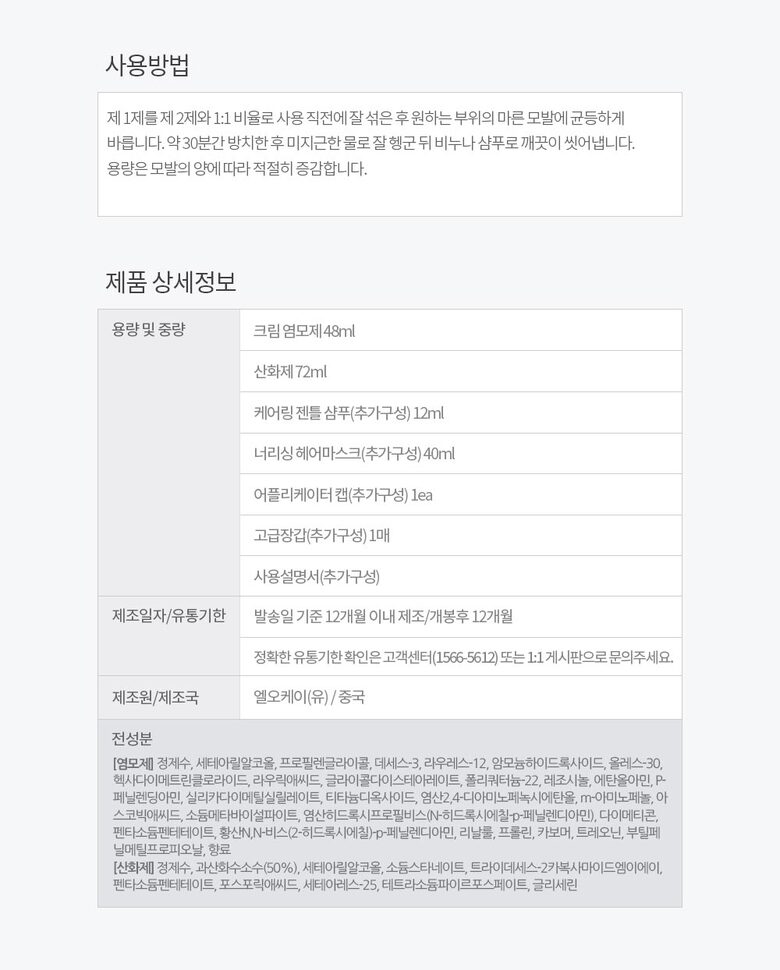 | 4. 사용방법 | 제 1제를 제 2제와 1:1 비율로 사용 직전에 잘 섞은 후 원하는 부위의 마른 모발에 균등하게 바릅니다. 약 30분간 방치한 후 미지근한 물로 잘 헹군 뒤 비누나 샴푸로 깨끗이 씻어냅니다. 용량은 모발의 양에 따라 적절히 증감합니다. |