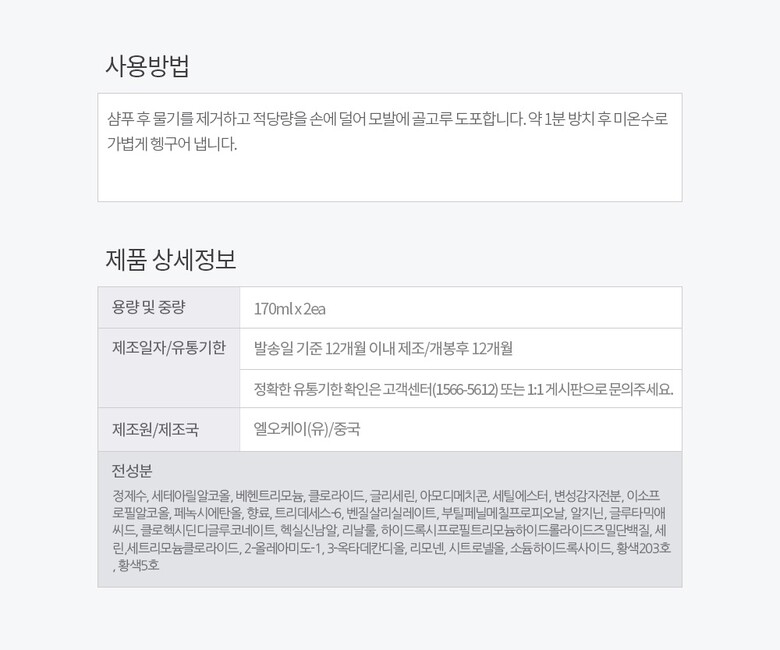 4. 사용방법 샴푸 후 물기를 제거하고 적당량을 손에 덜어 모발에 골고루 도포합니다. 약 1분 방치 후 미온수로 가볍게 헹구어 냅니다.
