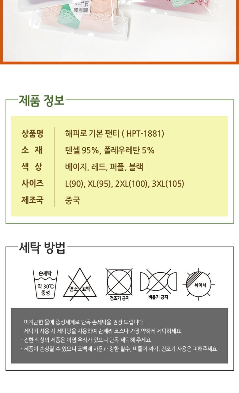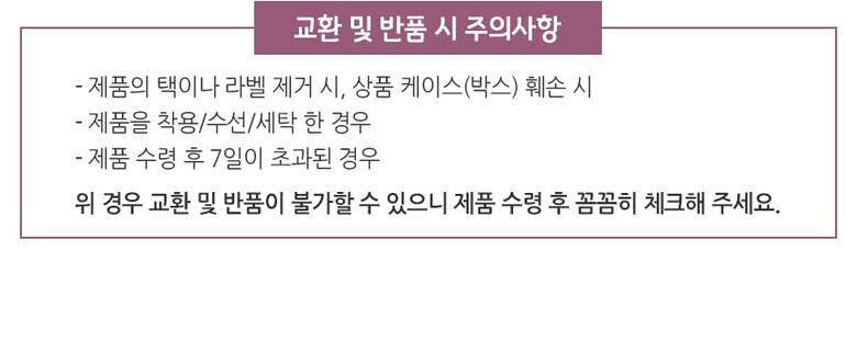 6. 세탁방법 및 취급시 주의사항 | - 30도 정도의 미온수에 중성세제를 녹인 후, 가볍게 주물러 빨아주세요 - 세탁기 사용 시 세탁망을 이용하거나 란제리코스로 세탁하세요. - 표백제 및 건조기 사용을 피해주세요 - 진한 색상은 이염 우려가 있으니 반드시 단독세탁해 주세요 |