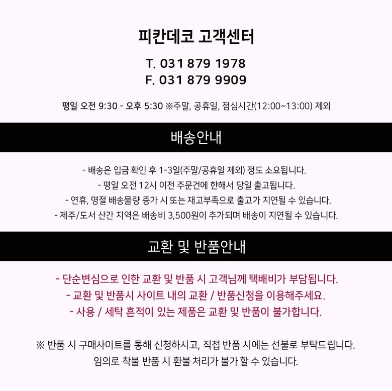 • 모든 규정은 전자상거래법에 의거하며, 택배사정으로 배송이 지연된 경우 재화를 공급받은 날로부터 7일 이내에 반품 가능합니다.