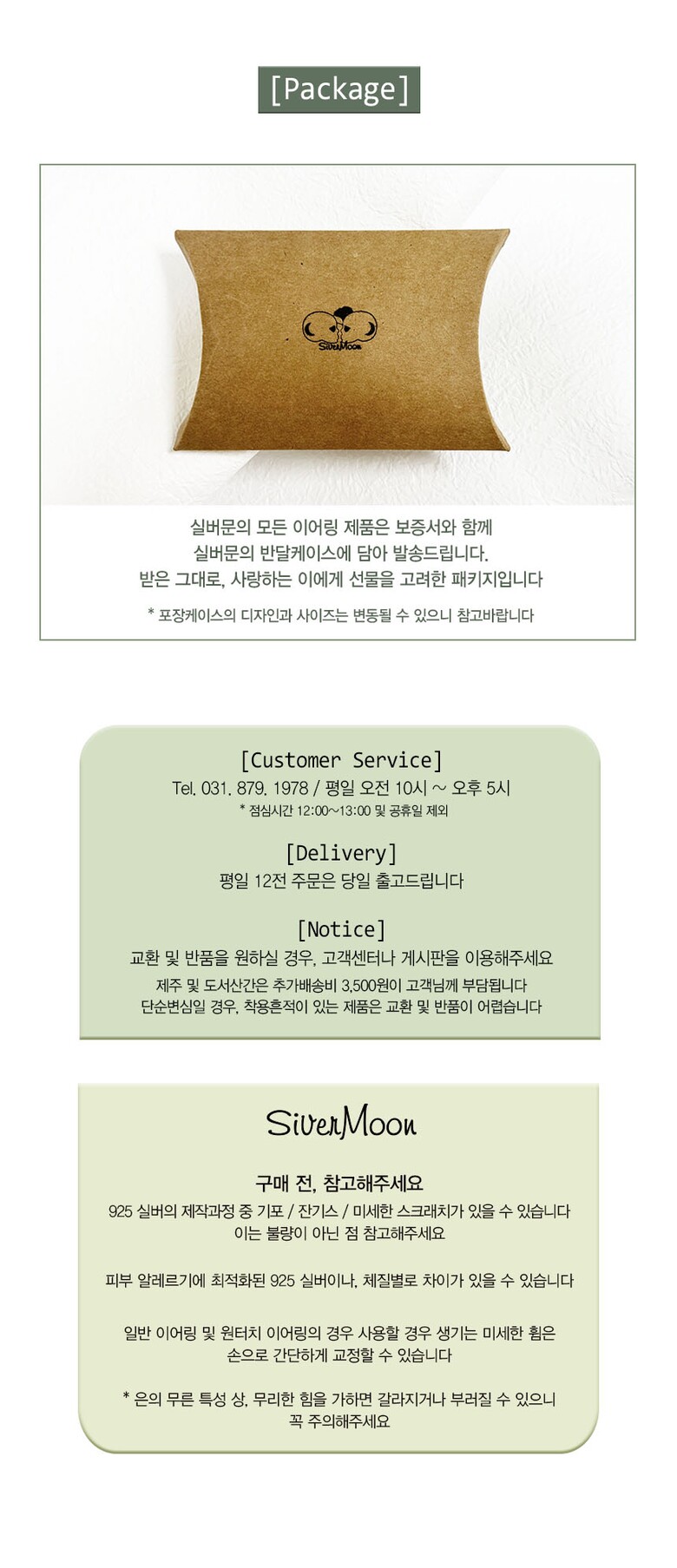 | 6. 착용 시 주의사항 | 광택천, 폴리백 등을 이용해 관리 빛 보관해주세요 은의 무른 특징 상, 큰힘을 가하면 갈라지거나 부러질 수 있으니 주의해주세요 |
