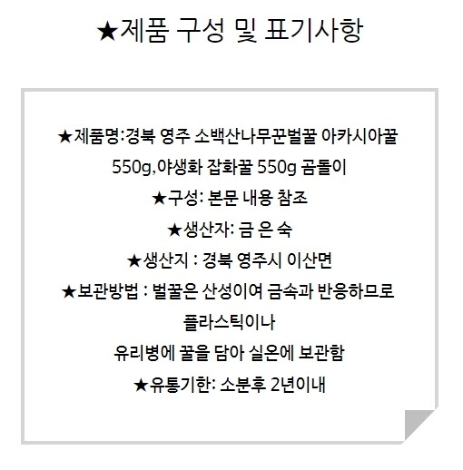 해당 상품은 여러가지 구성이 있으니 구매를 원하시는 구성의 상품명과 상세페이지의 내용이 일치하는지 확인 후 구매 부탁드립니다. 해당 상품은 [ 천연벌꿀 아카시벌꿀 500g ] 구성의 상품입니다.