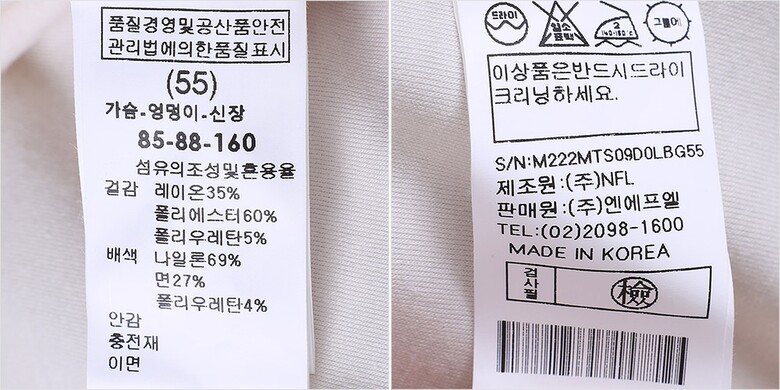 | 1. 제품 소재 (섬유의 조성 또는 혼용률을 백분율로 표시, 기능성인 경우 성적서 또는 허가서) | 겉감:폴리에스터60% 폴리우레탄5% 레이온35% 배색:나일론69%면27%폴리우레탄4% |