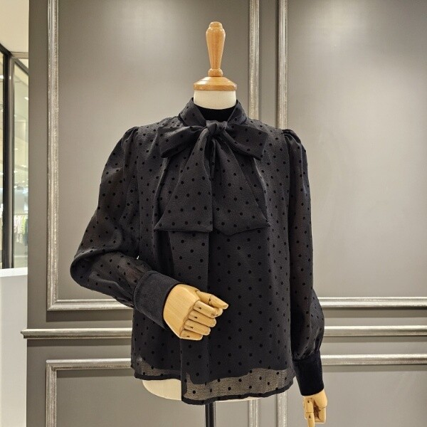 퍼프소매 디자인의 토트패턴 블라우스입니다. 소매 시스루 디자인으로 소매와 넥라인으로 벨벳으로 디자인되어 고급스러움과 페미닌한 스타일링을 하시기 좋아요
