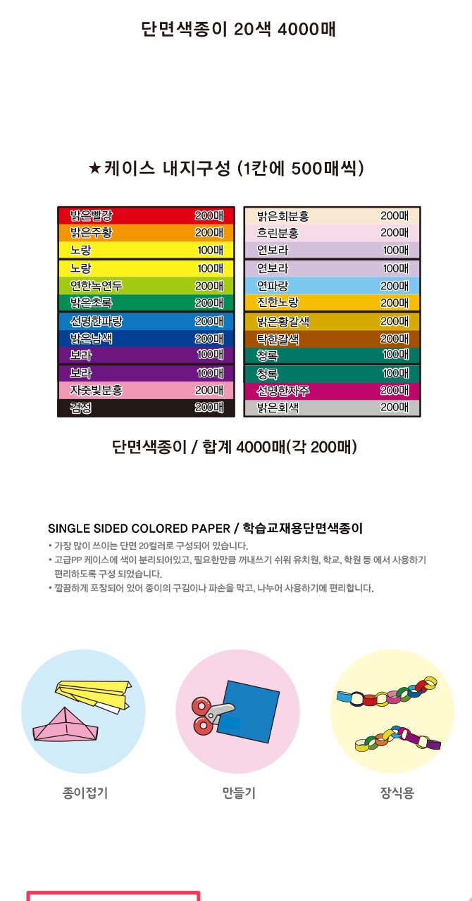 [종이나라] 색종이학습교재용단면대용량 20색4000매