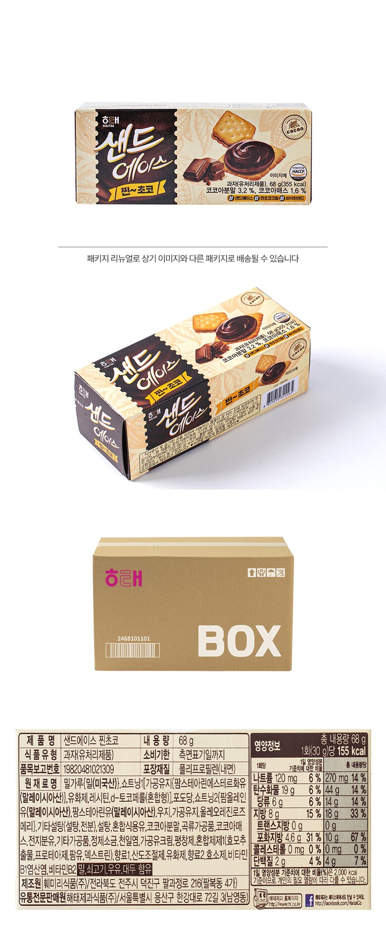 해당 상품은 [ 해태 샌드에이스 찐초코 68g 24입 ] 구성의 상품입니다.