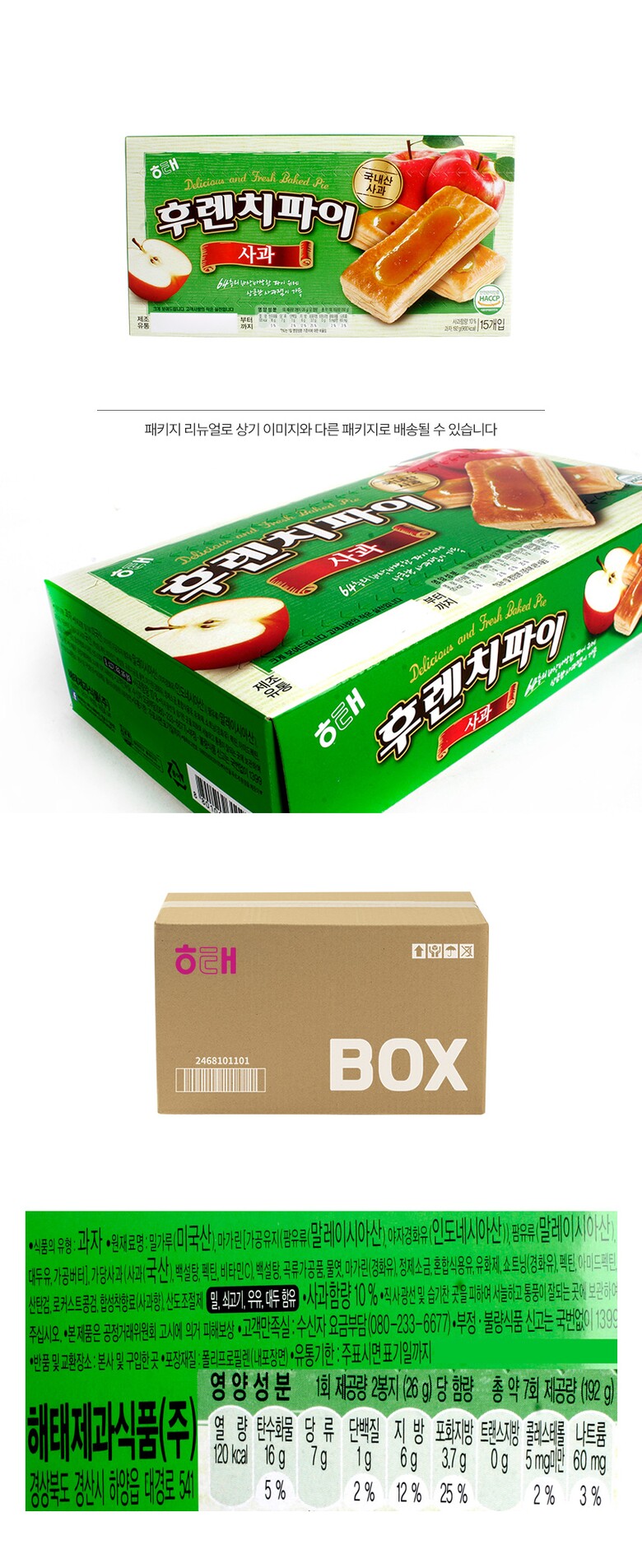해당 상품은 [ 해태 후렌치파이 사과 192g 12입 ] 구성의 상품입니다.