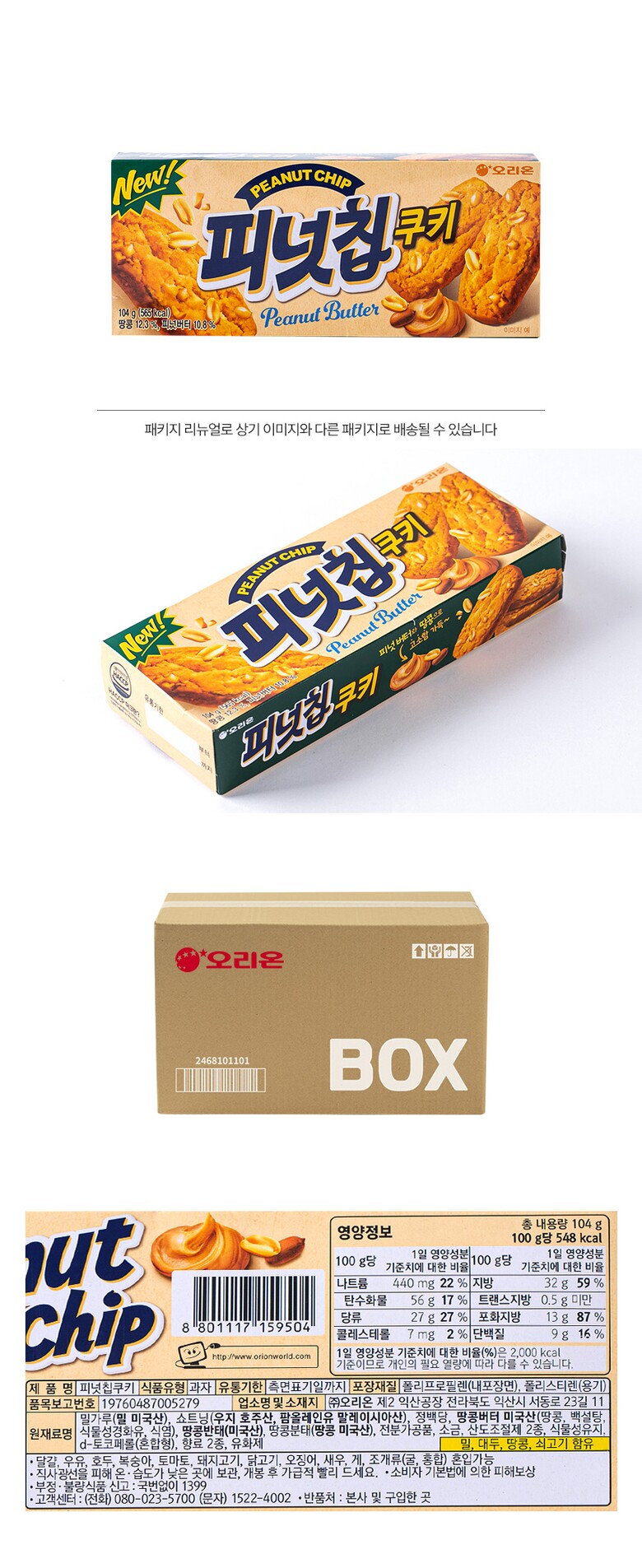 해당 상품은 [ 오리온 피넛칩쿠키 104g 21입 ] 구성의 상품입니다.