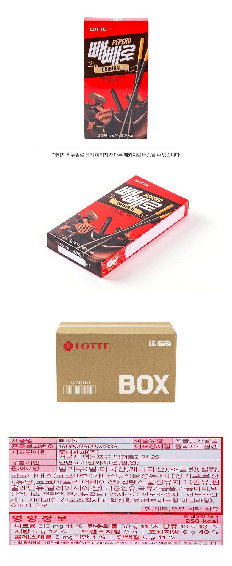 해당 상품은 여러가지 구성이 있으니 구매를 원하시는 구성의 상품명과 상세페이지의 내용이 일치하는지 확인 후 구매 부탁드립니다. 해당 상품은 [ 롯데 초코 빼빼로 54g 40입 ] 구성의 상품입니다.