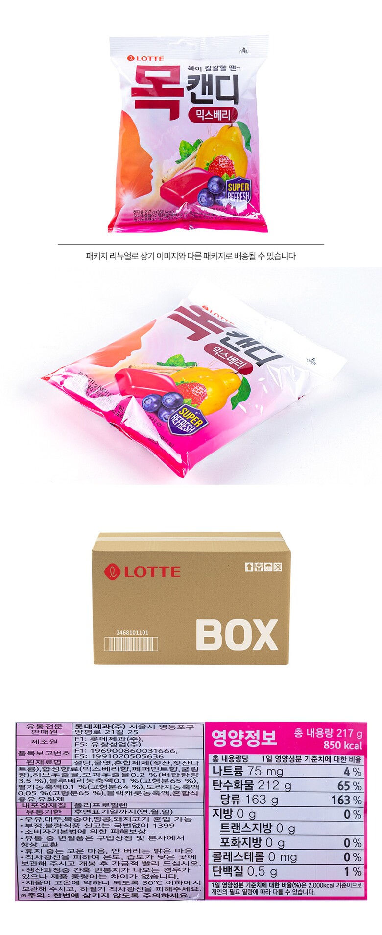 해당 상품은 [ 롯데 목캔디 믹스베리봉 217g 6입 ] 구성의 상품입니다.