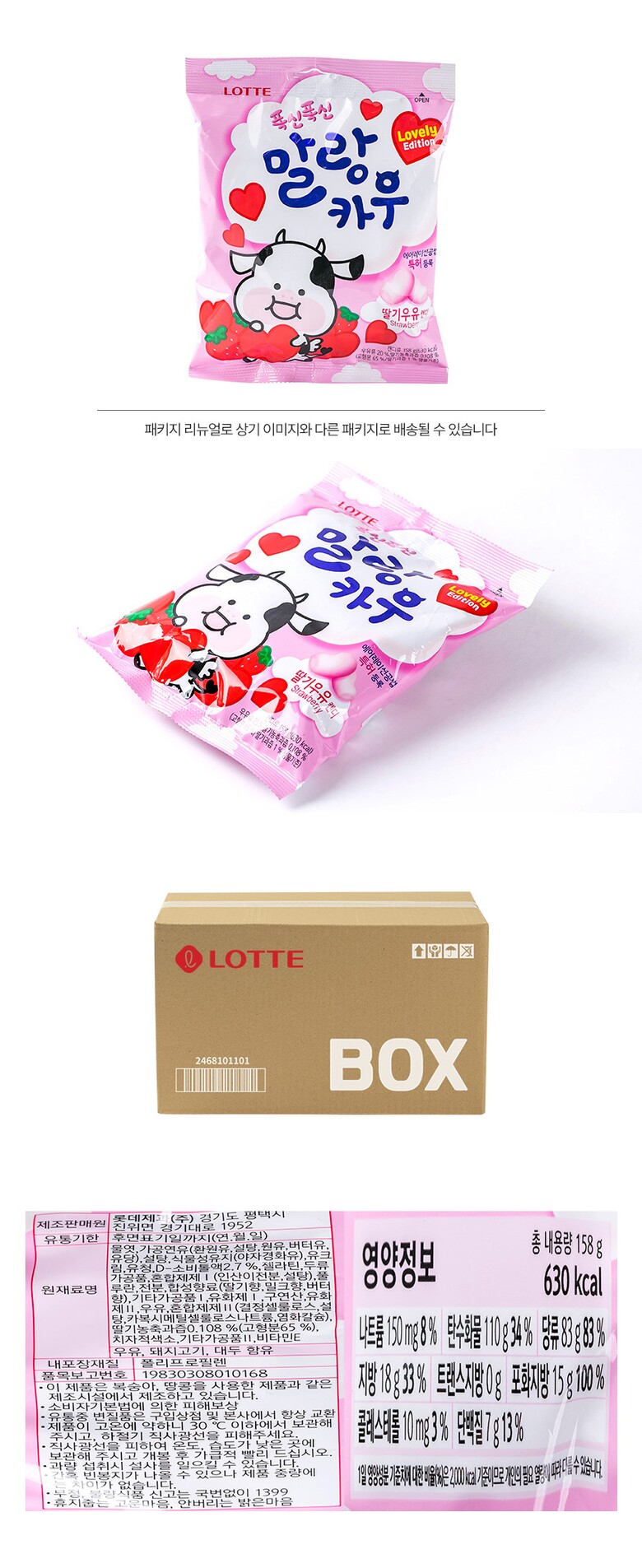 해당 상품은 [ 롯데 말랑카우 딸기 158g 8입 ] 구성의 상품입니다.