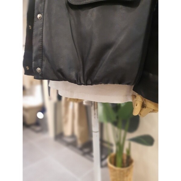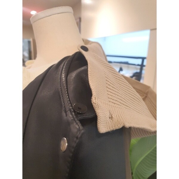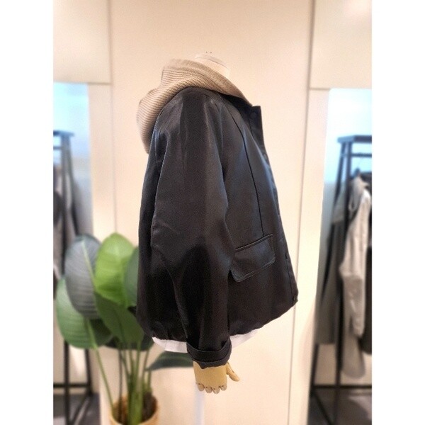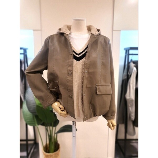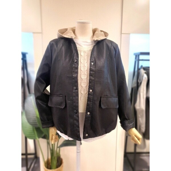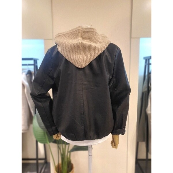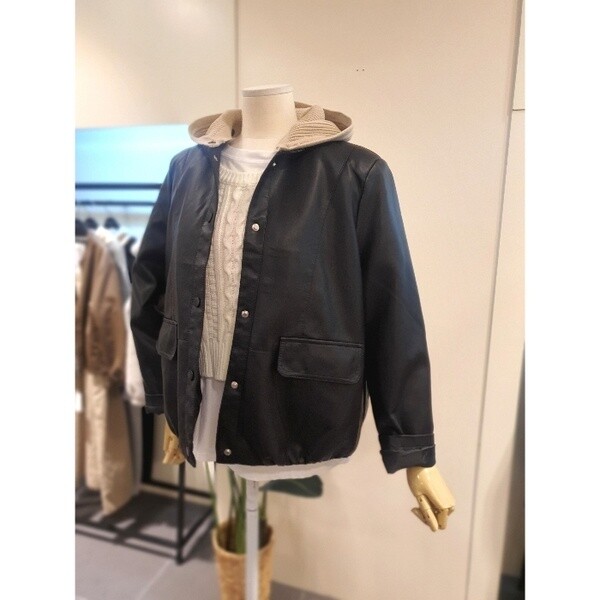 니트짜임의 배색 탈부착 후드가 달린 가죽 점입니다.밑단에 밴딩이 있어 시보리처럼 모양이 잡히는 디자인입니다.두껍지 않아 봄부터 초여름까지 착용 가능합니다.배색의 니트 후드가 캐주얼하면서도 세련된 분위기를 만들어줍니다.후드 버튼형으로 탈부탁이 가능합니다.주머니 있습니다. 정사이즈로 66사이즈까지 추천드립니다.