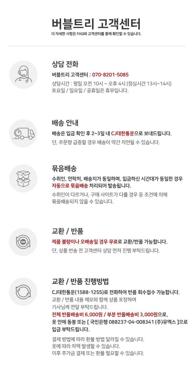 • 모든 규정은 전자상거래법에 의거하며, 택배사정으로 배송이 지연된 경우 재화를 공급받은 날로부터 7일 이내에 반품 가능합니다.