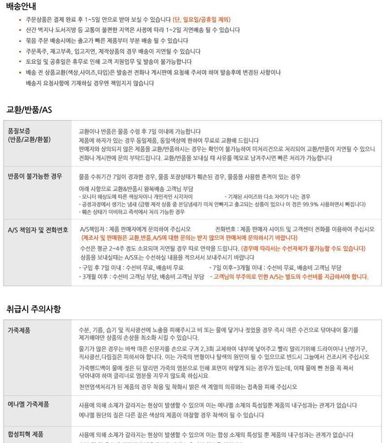 | 8. 품질보증기준 | 관련법 및 소비자분쟁해결기준에 따름 |