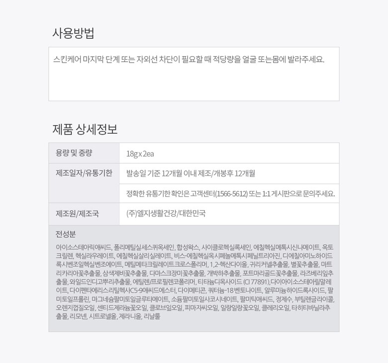 | 4. 사용방법 | 스킨케어 마지막 단계 또는 자외선 차단이 필요할 때 적당량을 얼굴 또는몸에 발라주세요. |
