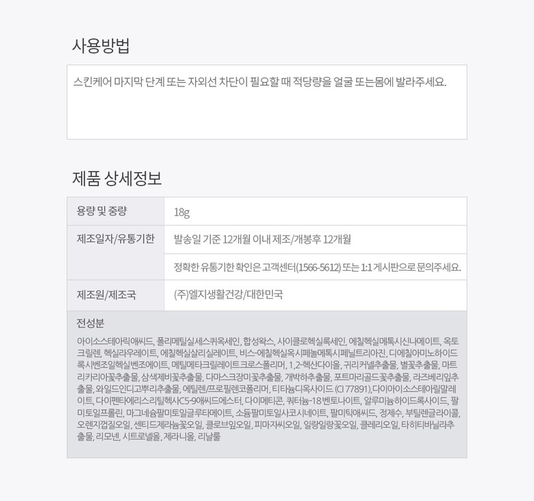 4. 사용방법 스킨케어 마지막 단계 또는 자외선 차단이 필요할 때 적당량을 얼굴 또는몸에 발라주세요.
