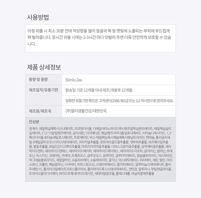 | 4. 사용방법 | 아침 외출 시 최소 30분 전에 적당량을 덜어 얼굴과 목 등 햇빛에 노출되는 부위에 부드럽게 펴 발라줍니다. 장시간 외출 시에는 2-3시간 마다 덧발라 주면 더욱 안전하게 보호할 수 있습 니다. |