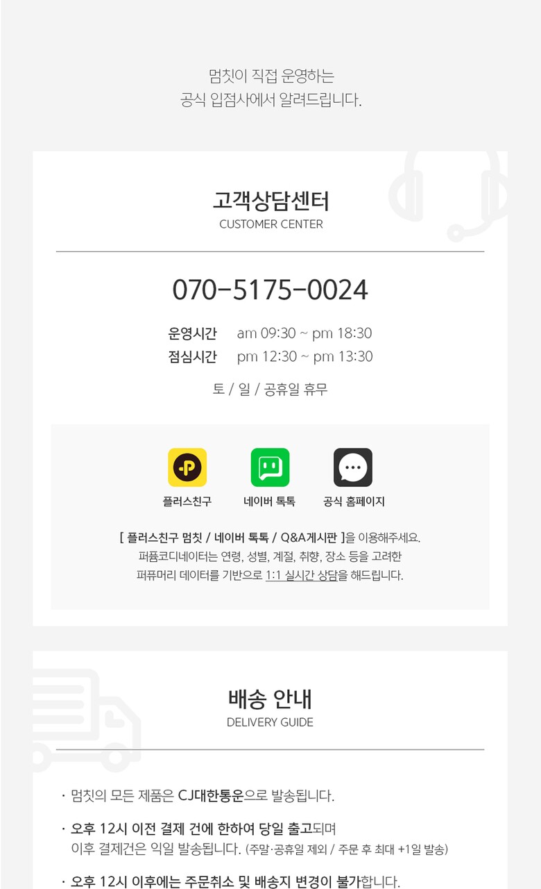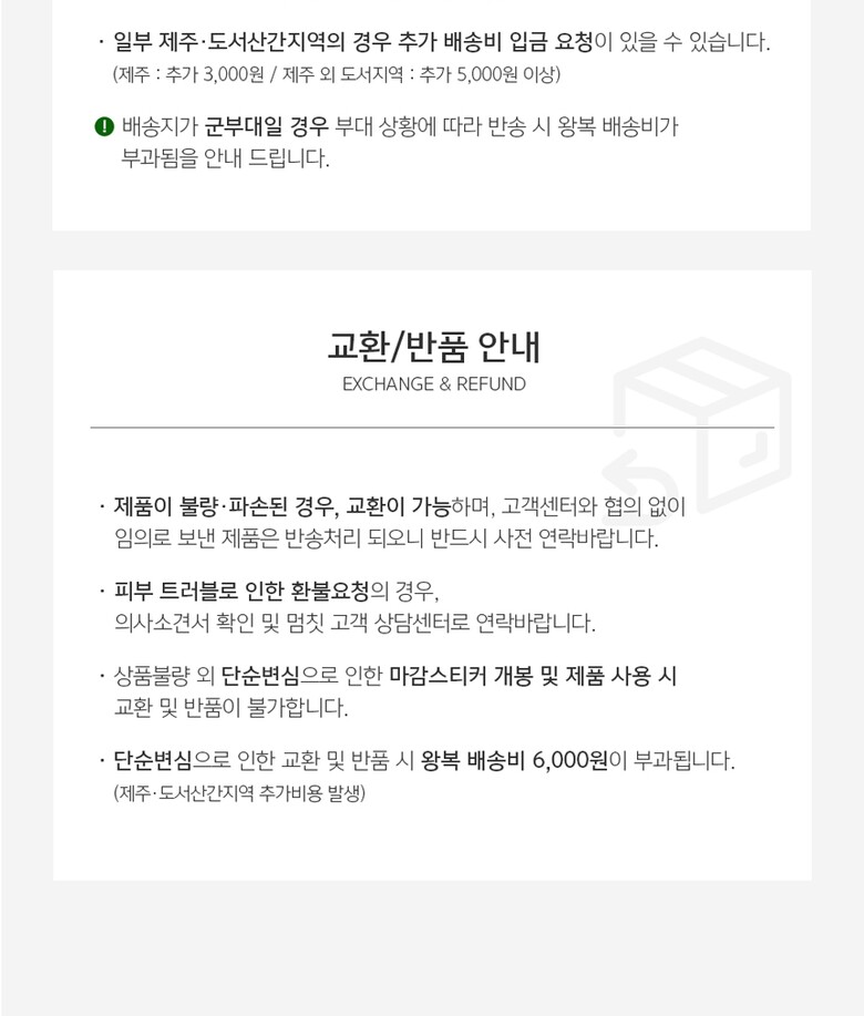 • 모든 규정은 전자상거래법에 의거하며, 택배사정으로 배송이 지연된 경우 재화를 공급받은 날로부터 7일 이내에 반품 가능합니다.