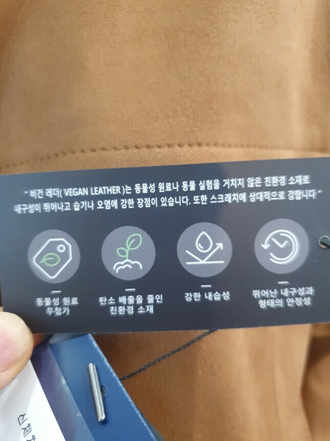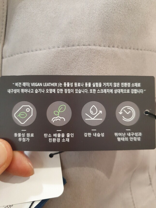 | 1. 제품 소재 (섬유의 조성 또는 혼용률을 백분율로 표시, 기능성인 경우 성적서 또는 허가서) | 겉감 : 인조가죽(합성가죽) 100% 안감1 : 폴리에스터 100% 안감2 : |
