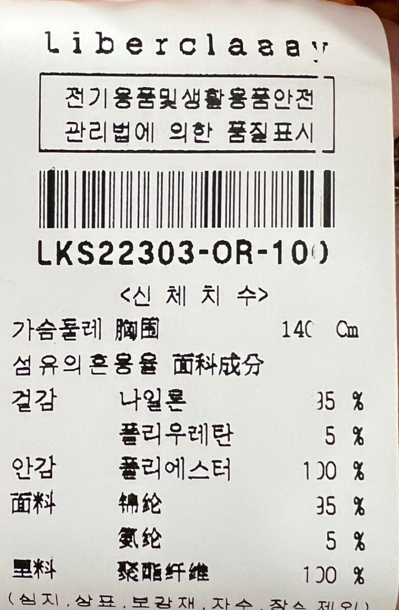 1. 제품 소재 (섬유의 조성 또는 혼용률을 백분율로 표시, 기능성인 경우 성적서 또는 허가서) 겉감:나일론 95%, 폴리우레탄 5% / 안감:폴리에스테르 100%