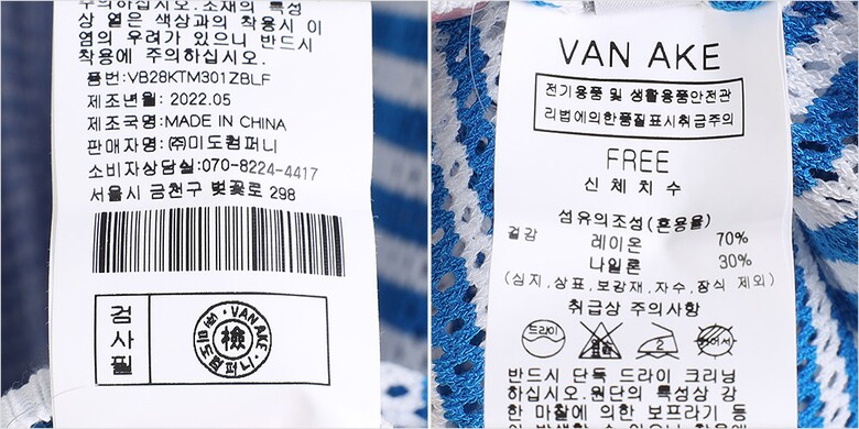 | 1. 제품 소재 (섬유의 조성 또는 혼용률을 백분율로 표시, 기능성인 경우 성적서 또는 허가서) | 겉감:나일론30% 레이온70% |