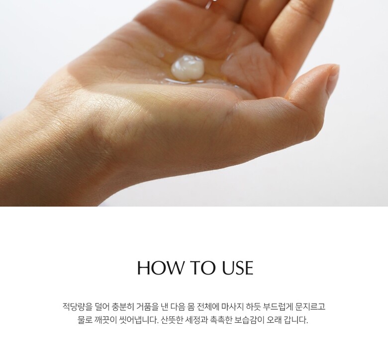 4. 사용방법 | 샤워용 타월에 적당량을 덜어 거품을 낸 다음 부드럽게 마사지 하듯이 문지른 후 미온수로 충분히 헹구어 냅니다. |