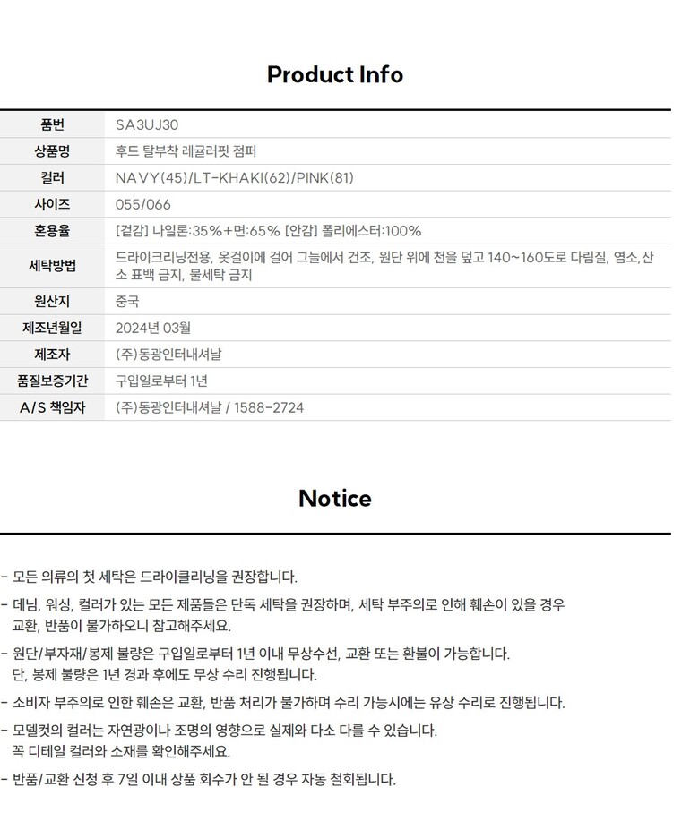 | 6. 세탁방법 및 취급시 주의사항 | 상품상세참조 |