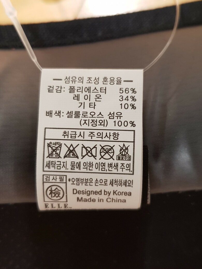 | 2. 소재 | 겉감:폴리에스터56%,레이온34%,기타10% 배색:셀룰로오스 섬유 |