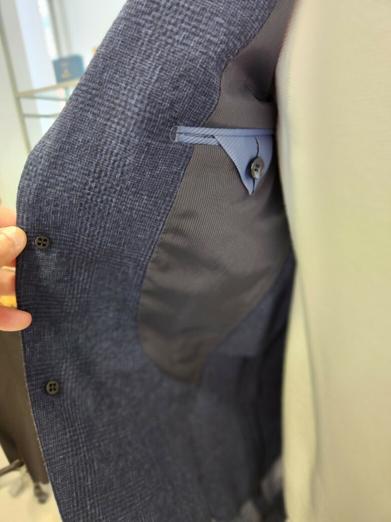 시원한 블루 컬러의 체크 기본 콤비 자켓 입니다.