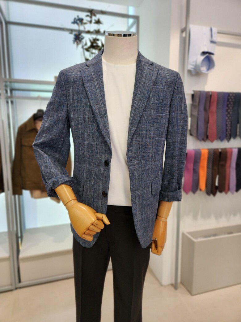 시원한 블루 컬러의 체크 기본 콤비 자켓 입니다.