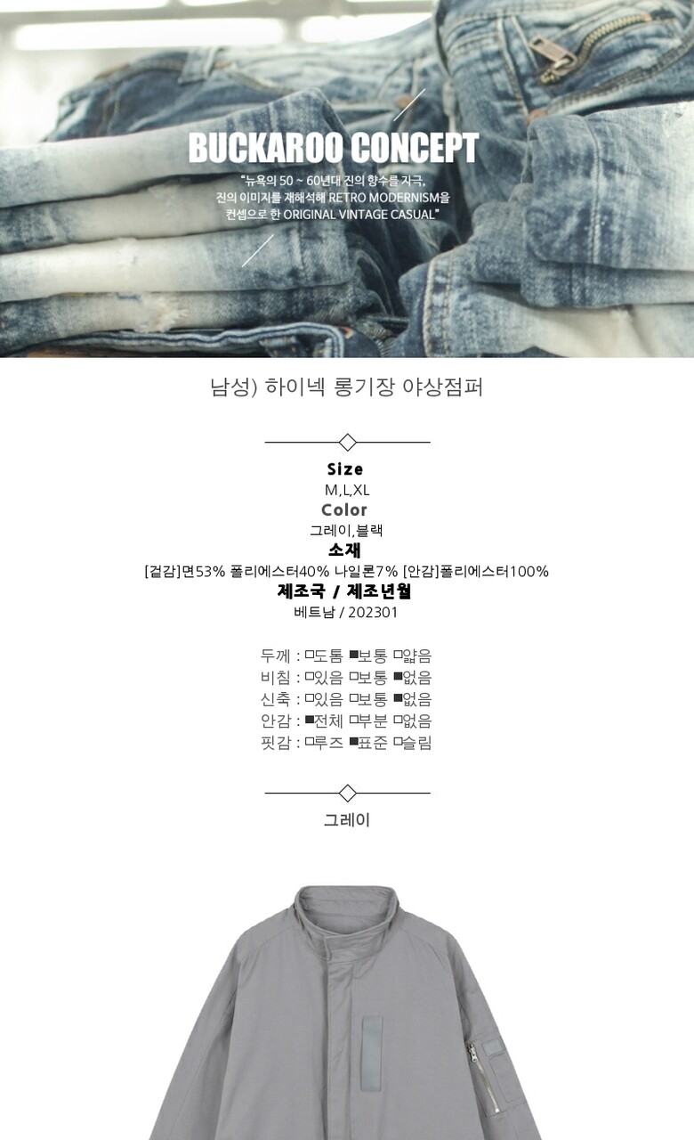 1. 제품 소재 (섬유의 조성 또는 혼용률을 백분율로 표시, 기능성인 경우 성적서 또는 허가서) | [겉감]면53% 폴리에스터40% 나일론7% [안감]폴리에스터100% |