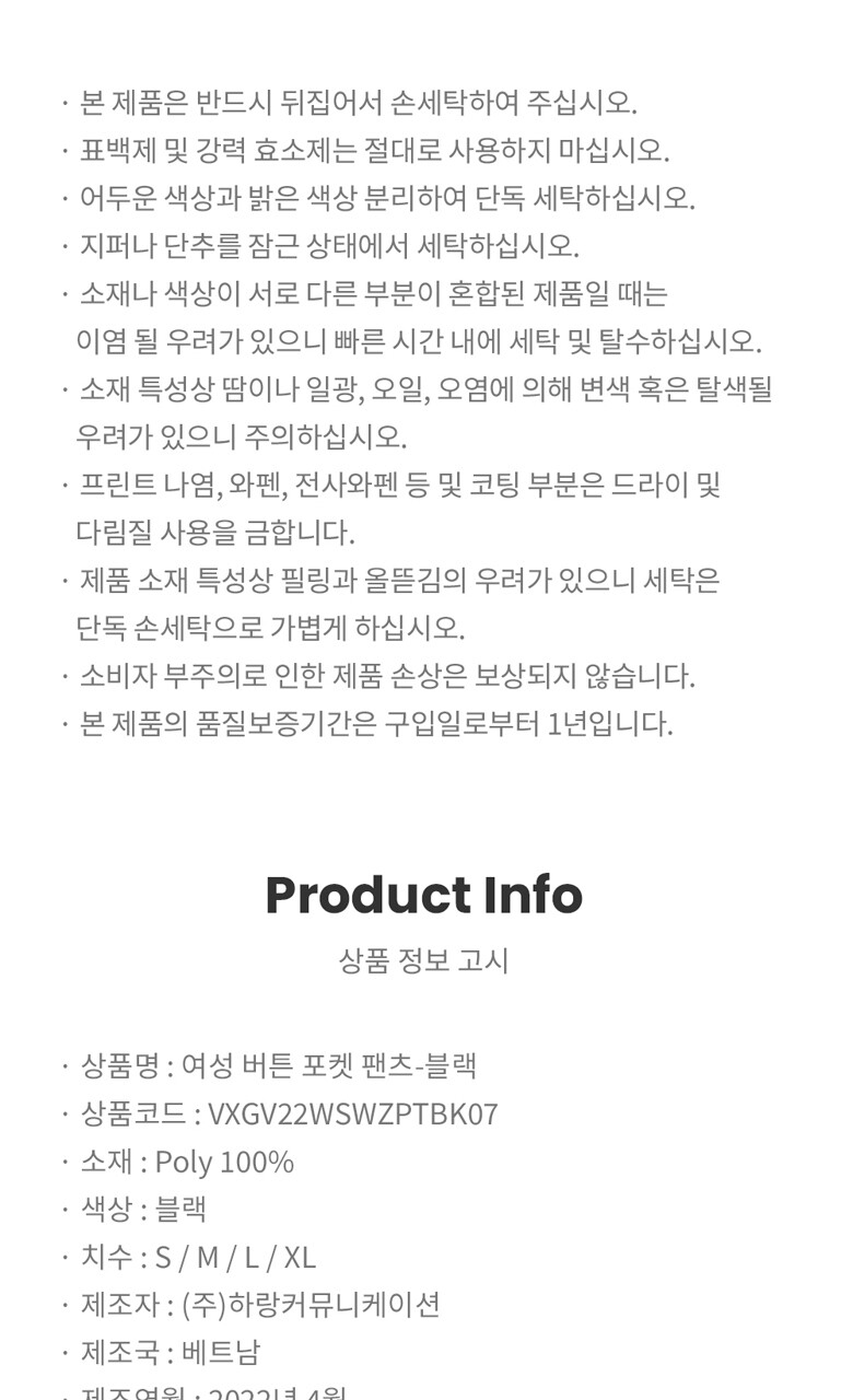 | 6. 세탁방법 및 취급시 주의사항 | 손세탁 |