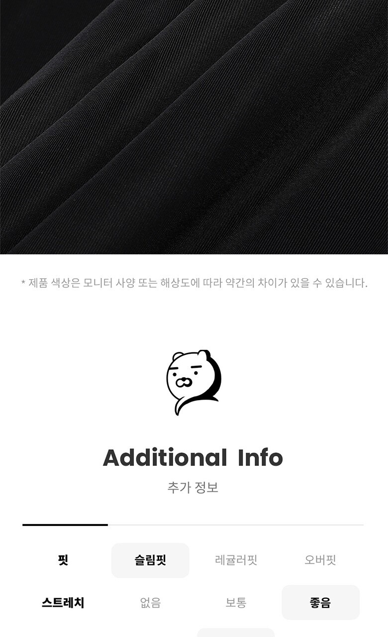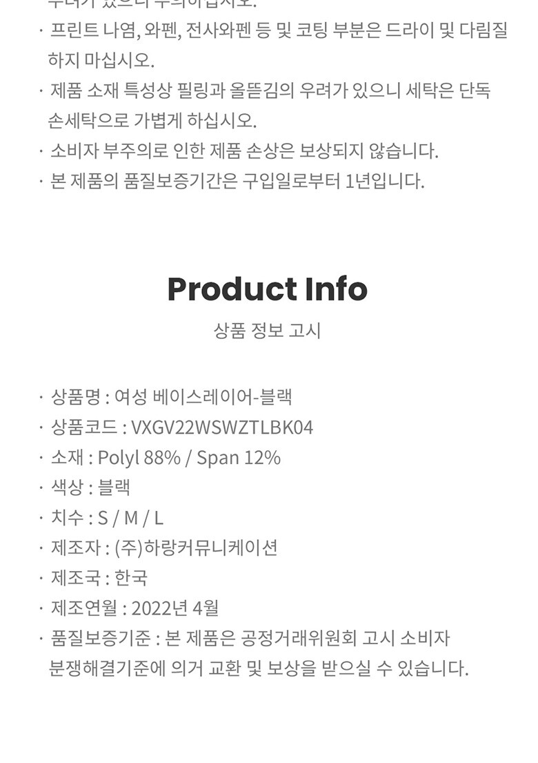 1. 제품 소재 (섬유의 조성 또는 혼용률을 백분율로 표시, 기능성인 경우 성적서 또는 허가서) | [겉감] 폴리에스터 88%, 스판 12% |