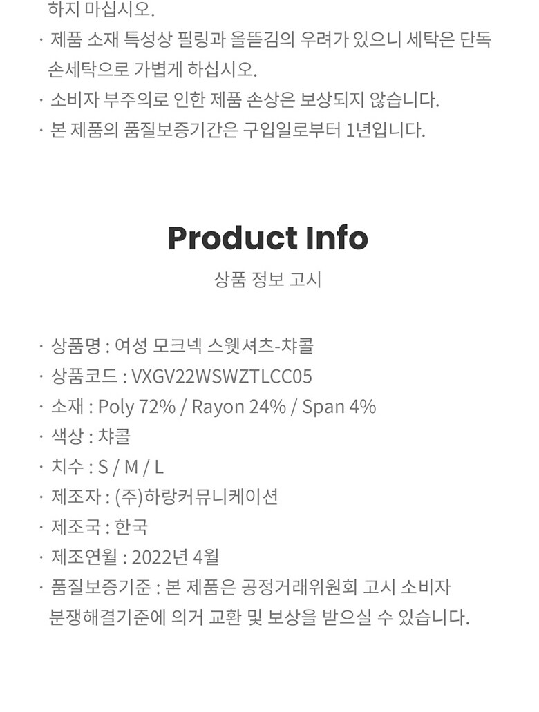 1. 제품 소재 (섬유의 조성 또는 혼용률을 백분율로 표시, 기능성인 경우 성적서 또는 허가서) [겉감] 폴리에스터 72%, 레이온 24%, 스판 4%