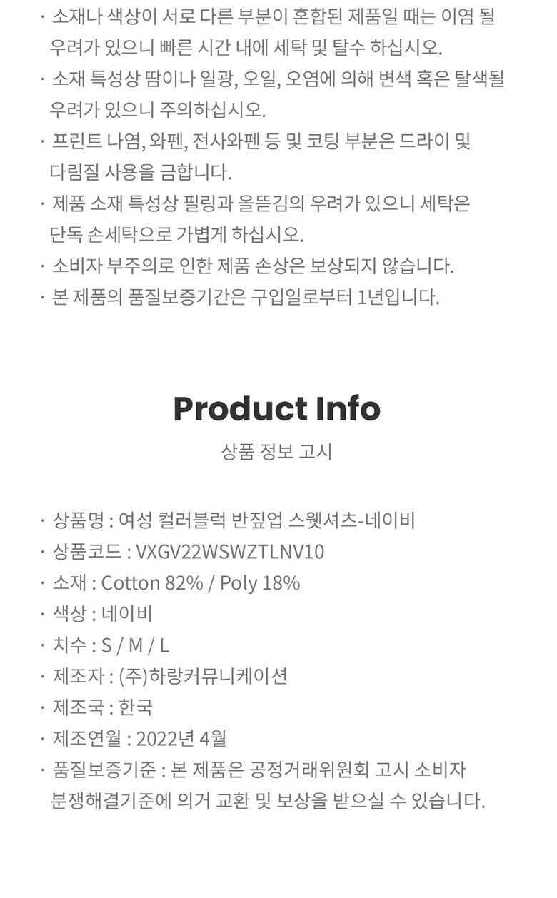 1. 제품 소재 (섬유의 조성 또는 혼용률을 백분율로 표시, 기능성인 경우 성적서 또는 허가서) | [겉감] 면 82%, 폴리 18% |