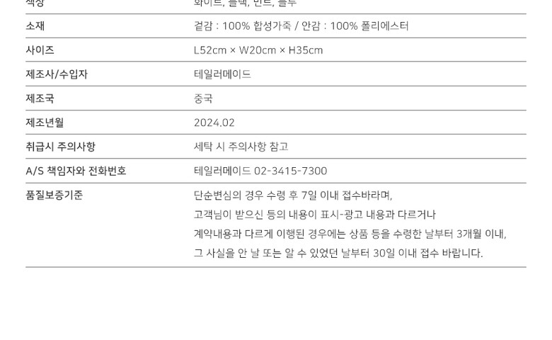 | 7. 품질보증기준 | 관련법 및 소비자분쟁해결기준에 따름 |