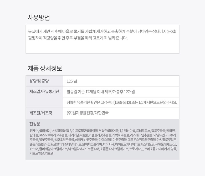4. 사용방법 욕실에서 세안 직후에 타올로 물기를 가볍게 제거하고 촉촉하게 수분이 남아 있는 상태에서 2~3회 펌핑하여 적당량을 취한 후 피부결을 따라 고르게 펴 발라 줍니다. 사용 후에는 평소 사용하는 순서대로 기초 스킨 케어를 하도록 합니다.