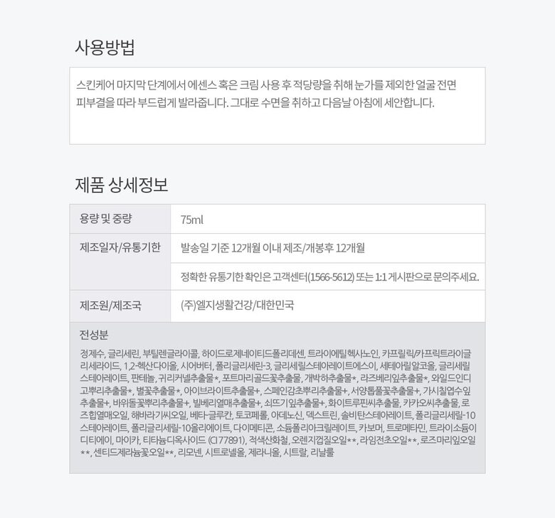 4. 사용방법 스킨케어 마지막 단계에서 에센스 혹은 크림 사용 후 적당량을 취해 눈가를 제외한 얼굴 전면