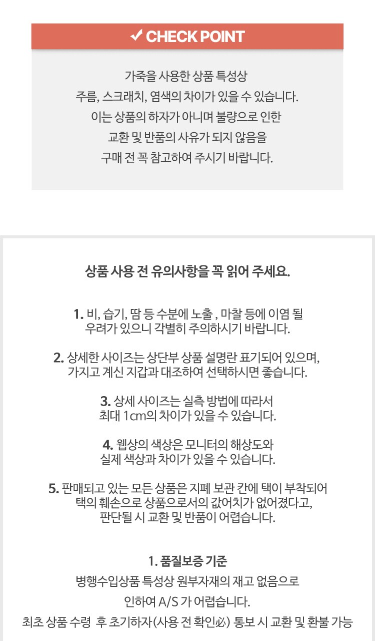 소가죽 공정상 발생할 수 있는 극소한 긁힘과 주름은 불량 사유가 될 수 없음을 사전에 안내해드립니다. |