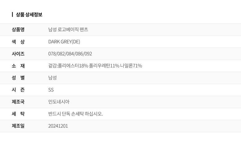 1. 제품 소재 (섬유의 조성 또는 혼용률을 백분율로 표시, 기능성인 경우 성적서 또는 허가서) 겉감:폴리에스터18% 폴리우레탄11% 나일론71%