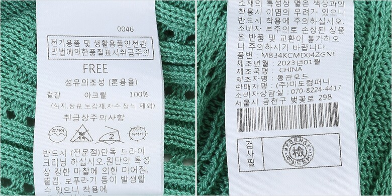 | 1. 제품 소재 (섬유의 조성 또는 혼용률을 백분율로 표시, 기능성인 경우 성적서 또는 허가서) | 겉감:아크릴100% |