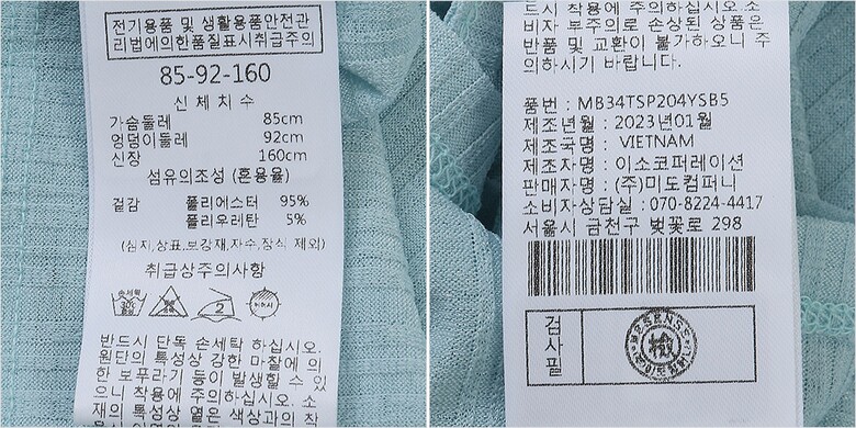| 1. 제품 소재 (섬유의 조성 또는 혼용률을 백분율로 표시, 기능성인 경우 성적서 또는 허가서) | 겉감:폴리에스터95% 폴리우레탄5% |